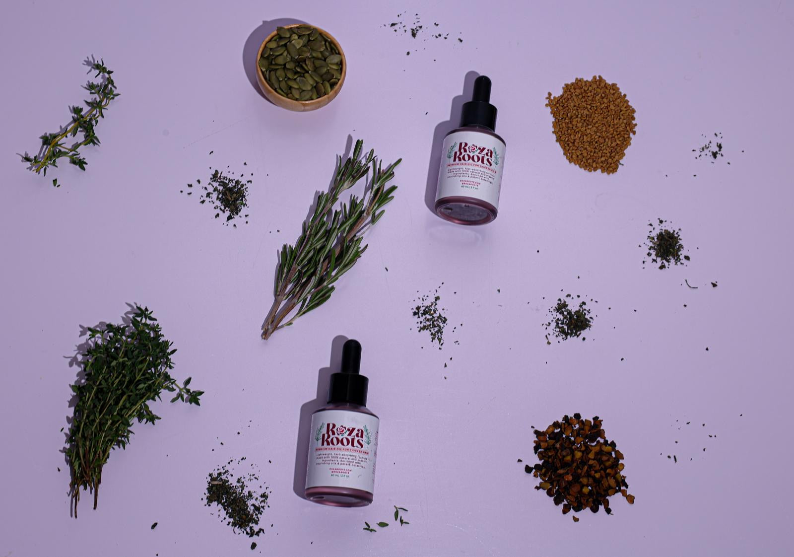 Roza Roots Hair Growth Oil is uniquely formulated with a blend of lightweight, fast-absorbing ingredients that target the root causes of hair thinning. our formula combines proven DHT blockers like pumpkin seed oil, saw palmetto, and green tea to directly address hair loss caused by hormonal imbalances. We also incorporate powerful botanicals like rosemary oil and amla oil to improve blood flow, strengthen hair from the roots, and promote natural shine.